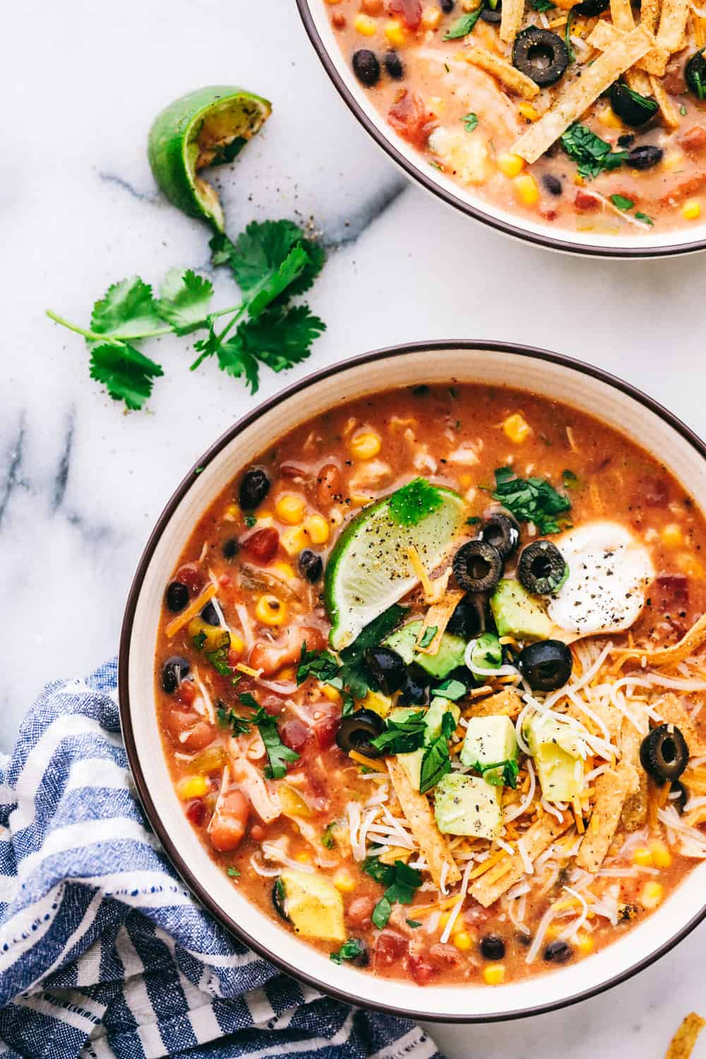 Olives: Sliced from a jar or can.Avocado: I like to add fresh avocado for a little contrast of flavor and color. They are delicious and full of vitamins.Sour Cream: A dollop on top is just what this soup needs!Tortilla Strips: A crunch that brings texture to the soup.Lime Wedges: The acid in the lime brightens up the whole soup, it’s perfect!