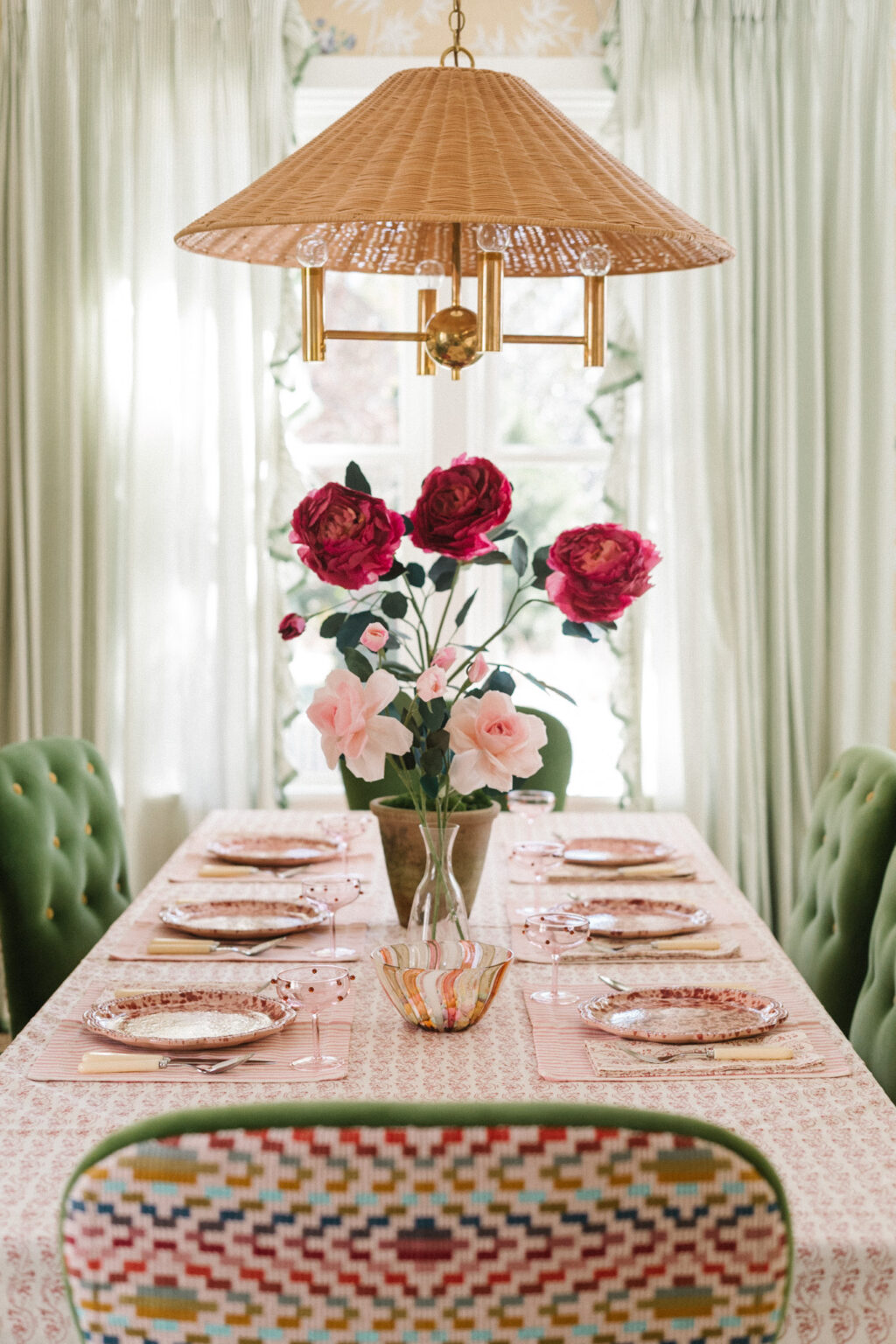 With Valentine’s Day around the corner, I wanted to bring our new dining room to life with something a little sweet and subtle. I started by laying down our Parterre tablecloth in our dusty, deeper pink Sibyl print. Placemats are usually optional for me, but I love the layered look with these pink striped placemats from House & Parties. I recently added these Cabana Plates to my collection- the colors are cool and easily mix to pair with many different table linens and palettes. Instead of fresh flowers, I grabbed all the Green Vase paper flowers I have and added them to the table, which means it’ll last a lot longer! See my full table edit below..