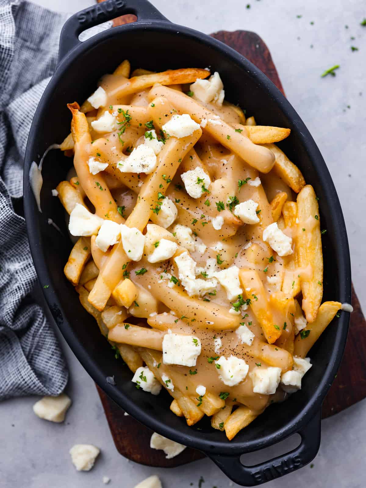 Fries: French fries are the base of the dish! I have some suggestions for how to cook the fries below in the recipe card.Cheese Curds: I like to add cheese curds on top for extra flavor. You could also add shredded cheese instead like mozzarella which melts really well.Butter: Butter adds delicious fat and flavor.All-Purpose Flour: This will help thicken up the gravy.Beef Broth: Beef broth or beef stock add so much extra flavor.Chicken Broth: I like to add both beef and chicken broth or chicken stock because it really makes this taste like traditional poutine.Salt and Pepper: To taste. If you use already salted fries you may want to add less salt here.