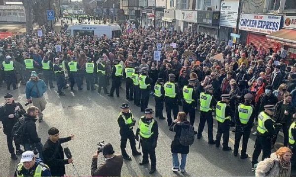 According to a report from Southwark News, “although police said the protests were ‘largely peaceful,’ five people were arrested – three for affray, one for a public order offense, and one for assault on an emergency worker and possession of an offensive weapon.”