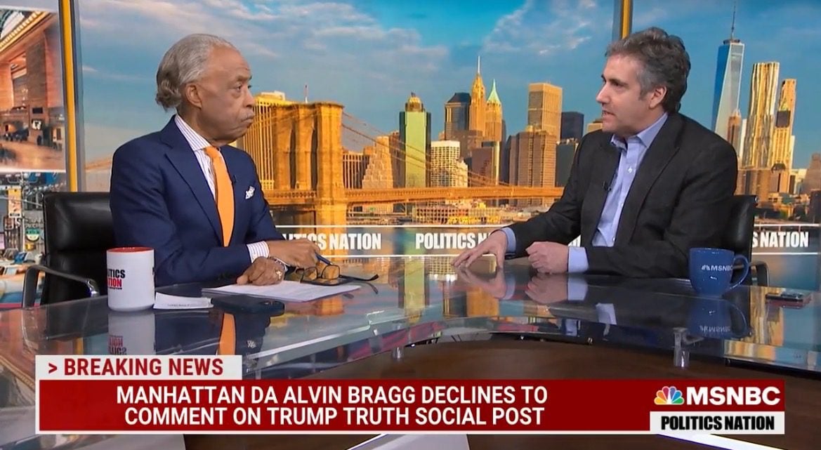 “Rest assured, Alvin Bragg is not making a mistake.” Michael Cohen speaks to Rev. Sharpton about the seriousness of the Manhattan DA’s case and why it could be the first to hold Trump accountable. https://t.co/MlCbQC2YKr pic.twitter.com/BzFBinHMGy