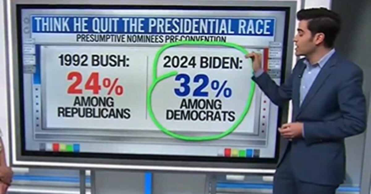 He continued, “Back in 1992 remember, George HW Bush faced Pat Buchanan in a primary, it wasn’t too serious. He won all the primaries, but there were still some inkling for him to get out of the race. This polling was taken after he was the presumptive nominee, 21% of Republicans thought that George HW Bush should get out of the race. Compare that now 32% of Democrats think that Joe Biden should get out. These numbers look a lot more comparable than the 52 or the 68 scenario.”