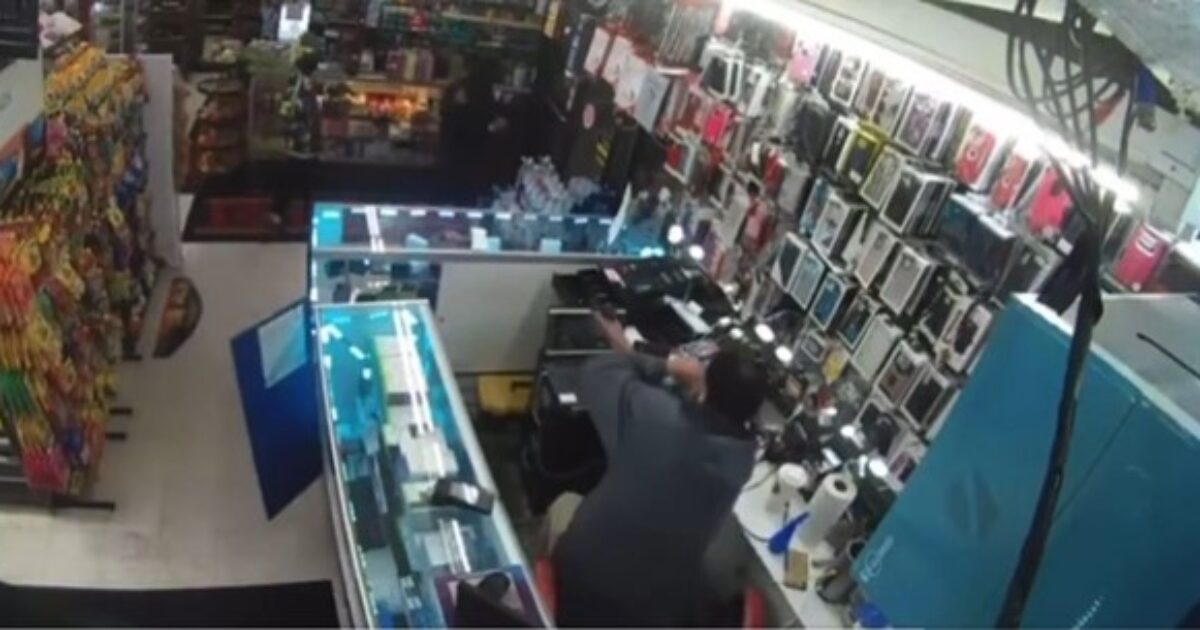 Still feeling a sense of danger, the clerk grabs his firearm and opens fire on one suspect. He falls to the floor.
