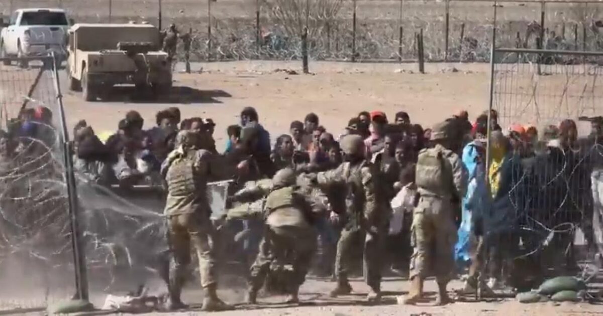 Texas National Guard members are seen being overrun by illegal immigrants trying to force their way across the southern border at El Paso, Texas. (@JennieSTaer / X screen shot)